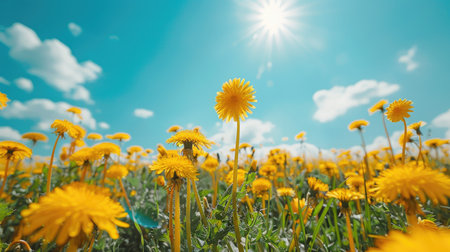 Dynamic Spring Landscape: Bright Yellow Dandelions and Clear Blue Sky in the Countryside