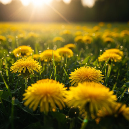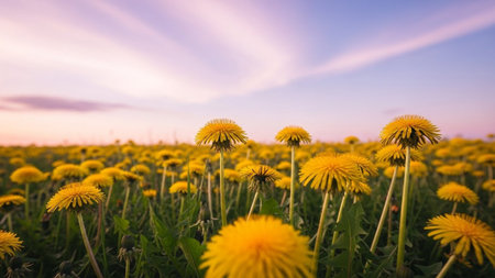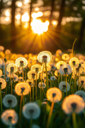 Dandelion field glowing during golden hour sunset in spring