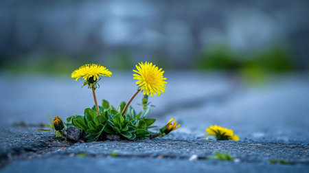 Yellow dandelion flowers growing on cracked asphalt, close-up