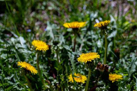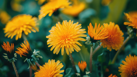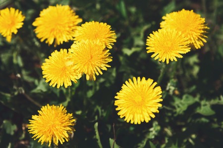 Close up of blooming yellow dandelion flowers