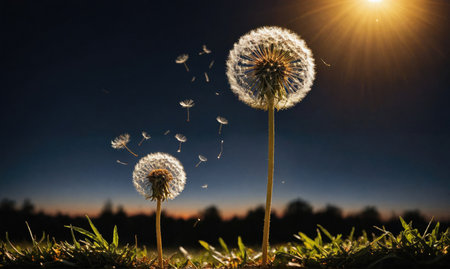 Two dandelions with delicate white seeds blow in the wind against a backdrop of a dark blue sky with a bright sun