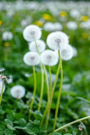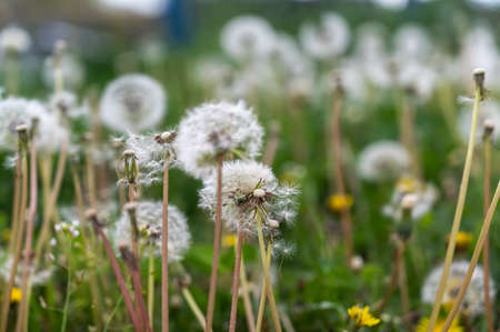 White fluffy dandelions bloom and fade in a green meadow among the field grass on a summer day. Nature.