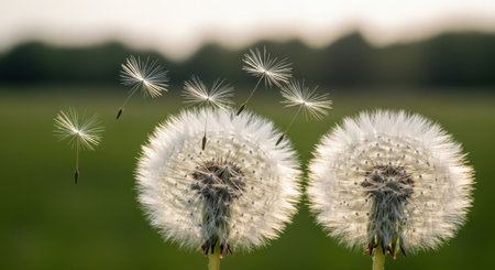 A close-up shot captures the enchanting process of dandelion seeds dispersing in nature. Two fully bloomed dandelion seed heads stand prominently against a soft, out-of-focus green background. Several feathery seeds, known as pappuses, are shown mid-air as they drift away from one of the seed heads, propelled by an unseen gentle breeze. The warm backlighting highlights the intricate structure of the fluffy seeds and creates a serene, idyllic atmosphere, symbolizing change, wish, and the life cycle of plants.