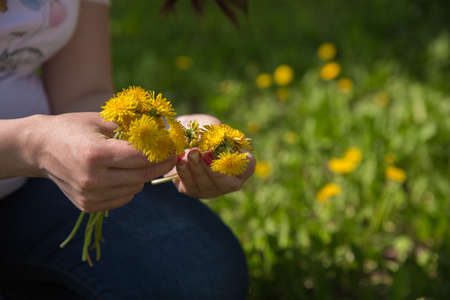 Bunch of yellow dandelion flowers in woman's hands, toned image