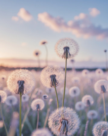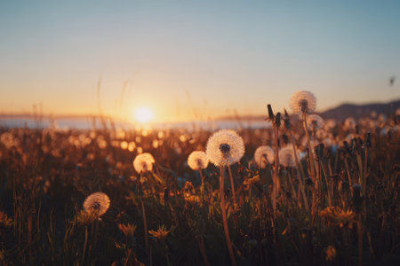 Dandelion field at sunset. Perfect for nature photography or peaceful art. Golden light adds warm glow.