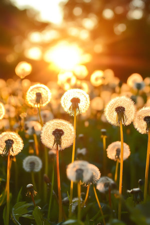 Delicate dandelions illuminated by golden sunset hues, their wispy seed heads casting a gentle glow against a tranquil evening sky.