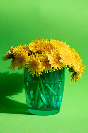 bouquet of dandelions in a glass on a gray background