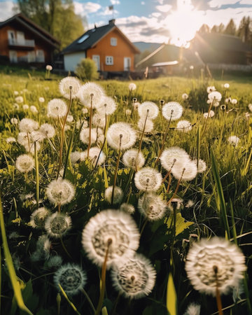 Generative AI : Many flowering dandelions on the lawn near the cottage in the summer in the sun A garden plot in the colors of a dandelion Background for summer holidays outside th