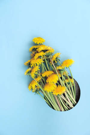Bouquet of yellow dandelions flowers on blue background. Concept Happy Summer. Template for postcard. The bouquet looks out of a paper hole.