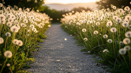 A gravel path through a field of fluffy dandelion clocks bathed in warm golden hour sunlight, with seeds floating.