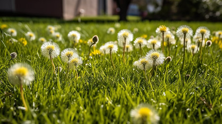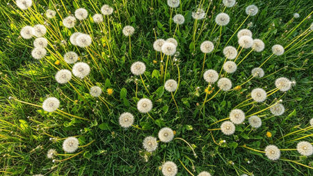Overhead perspective of a vibrant green grassy field covered with many fluffy white dandelion seed heads and...