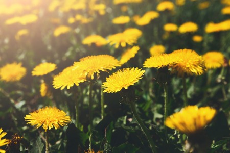 Yellow dandelions flowers on a spring floral background in a sunny day
