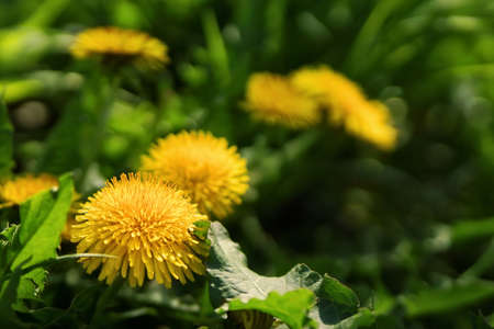 Bright yellow dandelion flowers bloom in the meadow on a summer morning. Wildflowers and nature.