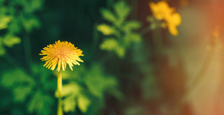 Blooming yellow dandelion opposite green grass with sunlight