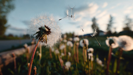 Natural showing field of dandelion seed heads at sunset with flying seeds and soft golden light keywords:...