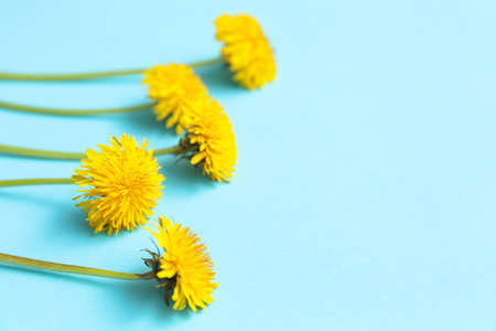 Yellow dandelions on blue background, closeup