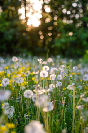 Dandelions in the field at sunset. Beautiful summer landscape.