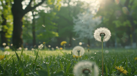 dandelion seeds with dew in an urban park generative ai