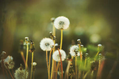 Fluffy white dandelions in a field in the light of a summer sunset