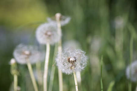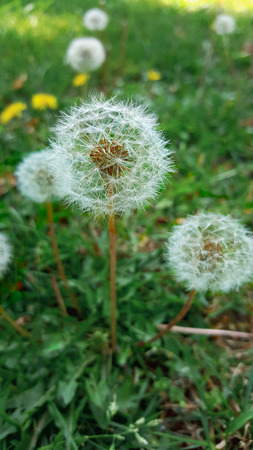 Velvet texture of Dandelion, with a green background of grass and more dandelions