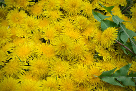 Dandelion flower natural yellow pattern or texture with leaves and blossoms close up. Spring yellow sunny floral background top view
