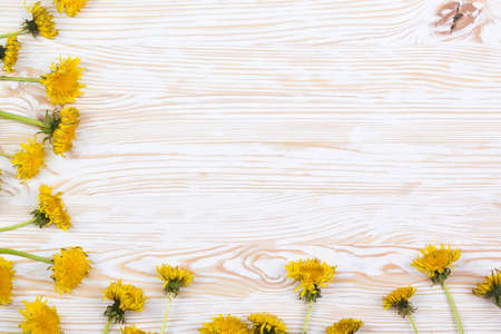 Yellow dandelion flowers on a green background summer and spring creative pattern with a copy space. flat lay