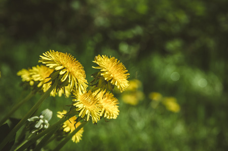 Yellow dandelion flowers on a green meadow in the sunny daylight.