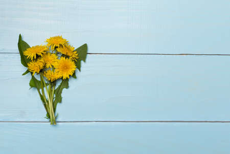 Hand holding yellow wildflowers dandelions on a light background, copy space, postcard. Bright spring wildflowers. Love, romance, wedding concept