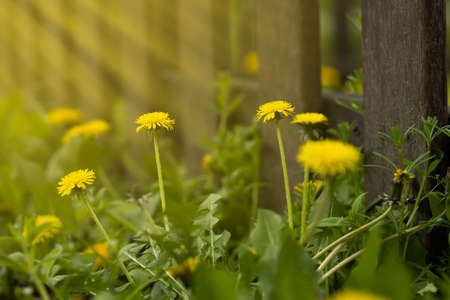 Yellow dandelion flowers growing near the fence illuminate the rays of the sun