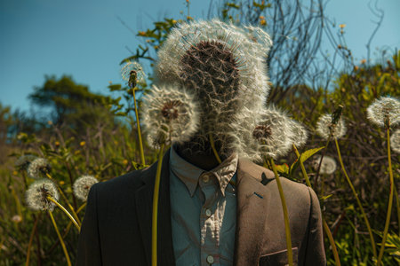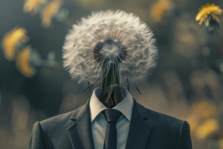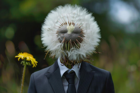 Artistic image of a businessman with a dandelion head symbolizing nature and corporate life blend