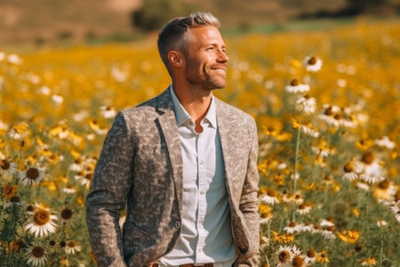 Blooms of Bliss: A Man With Flowers Embracing Natures Serenity in a Lush Field