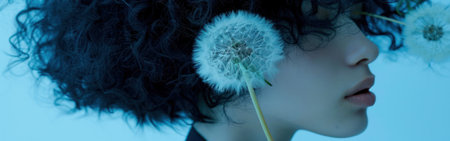 A woman is seen with a white dandelion resting gracefully in her hair.