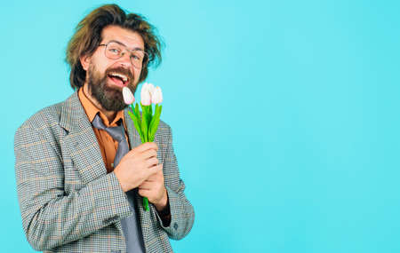 Businessman with bouquet of tulips for birthday. Handsome man with flowers. Smiling man with bouquet of flowers. Copy space.