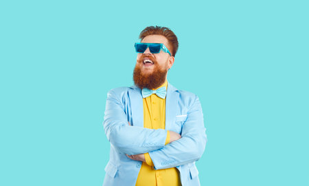 Cheerful bearded Caucasian man in funny sunglasses with arms crossed in front of him looks up to side copy space dressed in fashionable bright clothes, stands on turquoise background