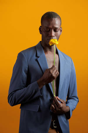 Portrait of African handsome man in suit smelling the flower in his hand standing against the yellow background