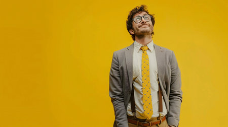A fashionable man smiles confidently against a vivid yellow backdrop. His stylish sunglasses and vibrant outfit highlight a modern, cheerful aura perfect for lifestyle imagery.