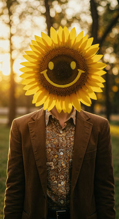 An individual wears a vibrant yellow sunflower with a cheerful smiley face as their head, standing in a sunny outdoor park during golden hour, representing joy and positive energy.