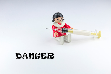 Doll playing with a syringe and warning sign