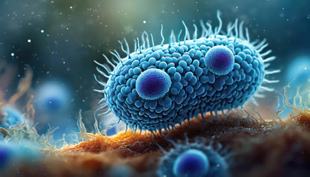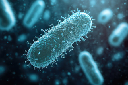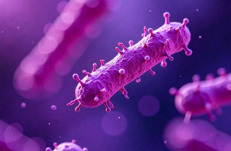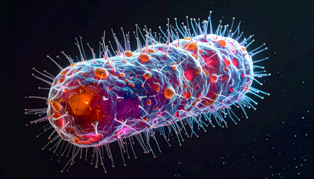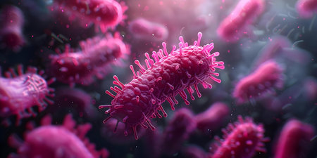 A close-up, glowing microscopic view of rod-shaped bacteria with spiky protrusions in a dark, vibrant...