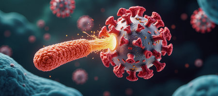 A 3D rendered illustration depicting immune system cells battling bacterial invaders