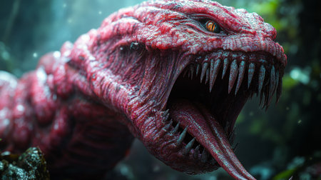 Ferocious red worm-like creature in a jungle environment, sharp teeth and glowing eyes, fantasy monster concept.