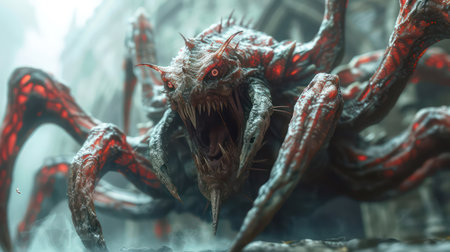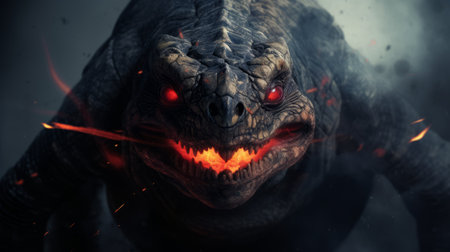The creature exudes terror with its jagged teeth and glowing eyes, set against a dimly lit backdrop that enhances its fierce presence and dramatic detail.