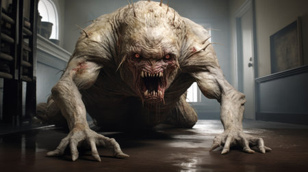 the demented creature, with its detailed character design, is captured in this photo. it is seen creeping in an empty room, showcasing a style of realistic rendering with explosive pigmentation. the dark beige and white tones add to the eerie atmosphere of the image, reminiscent of the works of artists like magali villeneuve, greg olsen, and ben wooten. ai generated