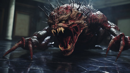 a creepy creature with a huge clawed body is captured in a hallway, rendered in the style of unreal engine. the creature's strong facial expression adds to the dynamic and action-packed scene. this tabletop photograph showcases the celestialpunk aesthetic, with its sharpprickly details and close-up perspective. ai generated
