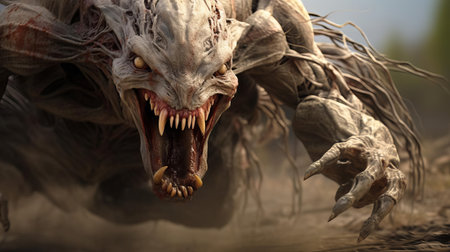 A large monster with big teeth and claws on a dark background, AI