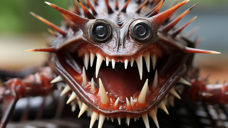 Close-up portrait of a terrible monster with sharp teeth and sharp teeth