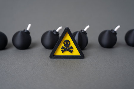 Caution bomb hazard. Dangerous situation. Mine clearance. Health hazard, carcinogens concept. Safety protocol. Crisis prevention.