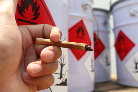 Hand holding lighter and flammable chemical symbol