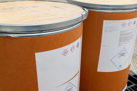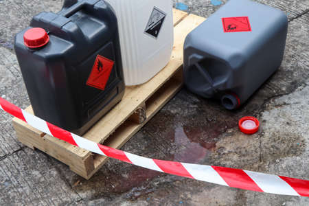 Bottles or jerricans with corrosive and harmful liquids for the environment, danger labels according to the international agreement on dangerous goods (ADR).