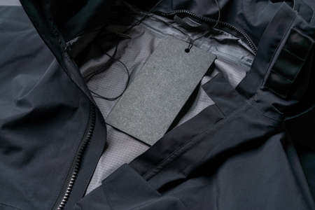 Blank Black Rectangular Clothing Tag, Label Mockup Template on Stylish Black Sportswear. Price Tag Label With Copy Space, Empty Space.